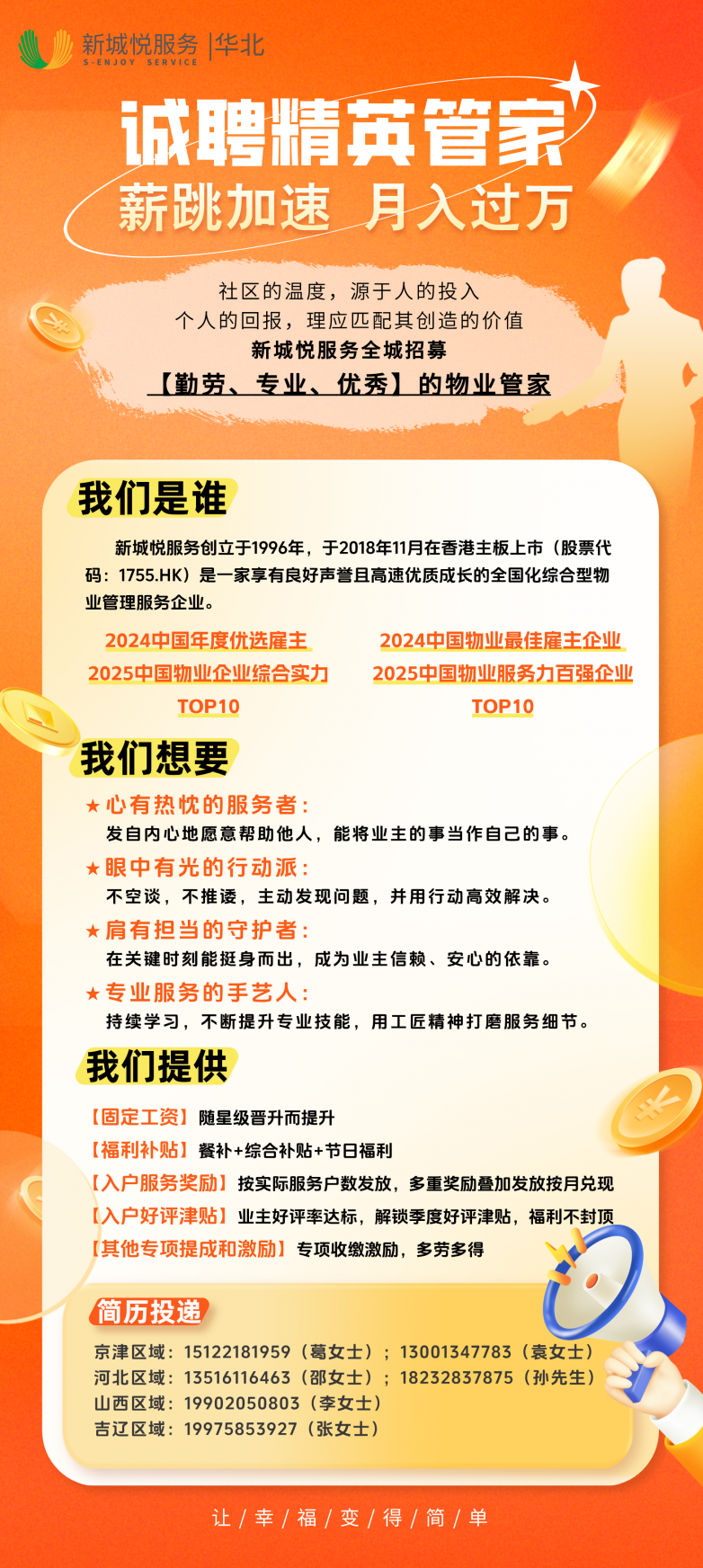 新城悦致力于打造行业口碑最好的管家服务团队-一专业、温暖、有战斗力。你身边是否也有踏实肯干、服务用心的潜力伙伴?快快投递简历,下一个“万元管家”,可能就是你!