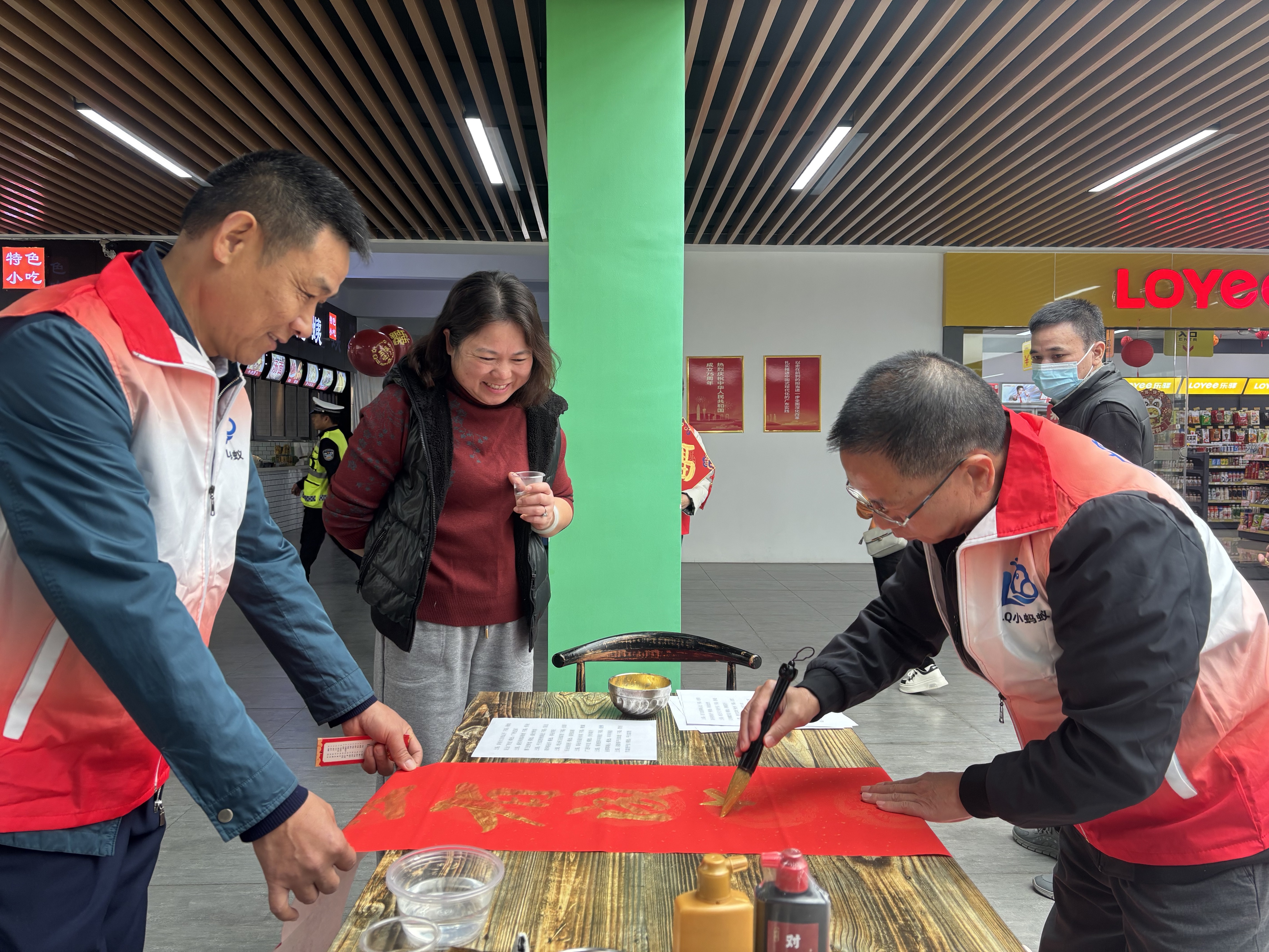 笔墨飘香的“挥春送福”区域,更是满溢着浓浓的年味。擅长书法的志愿者老刘挥毫泼墨、笔走龙蛇,一幅幅饱含新春祝福的对联跃然纸上。过往司乘纷纷驻足欣赏,挑选心仪的对联,捎上美好祝愿,平安踏上回家的路。